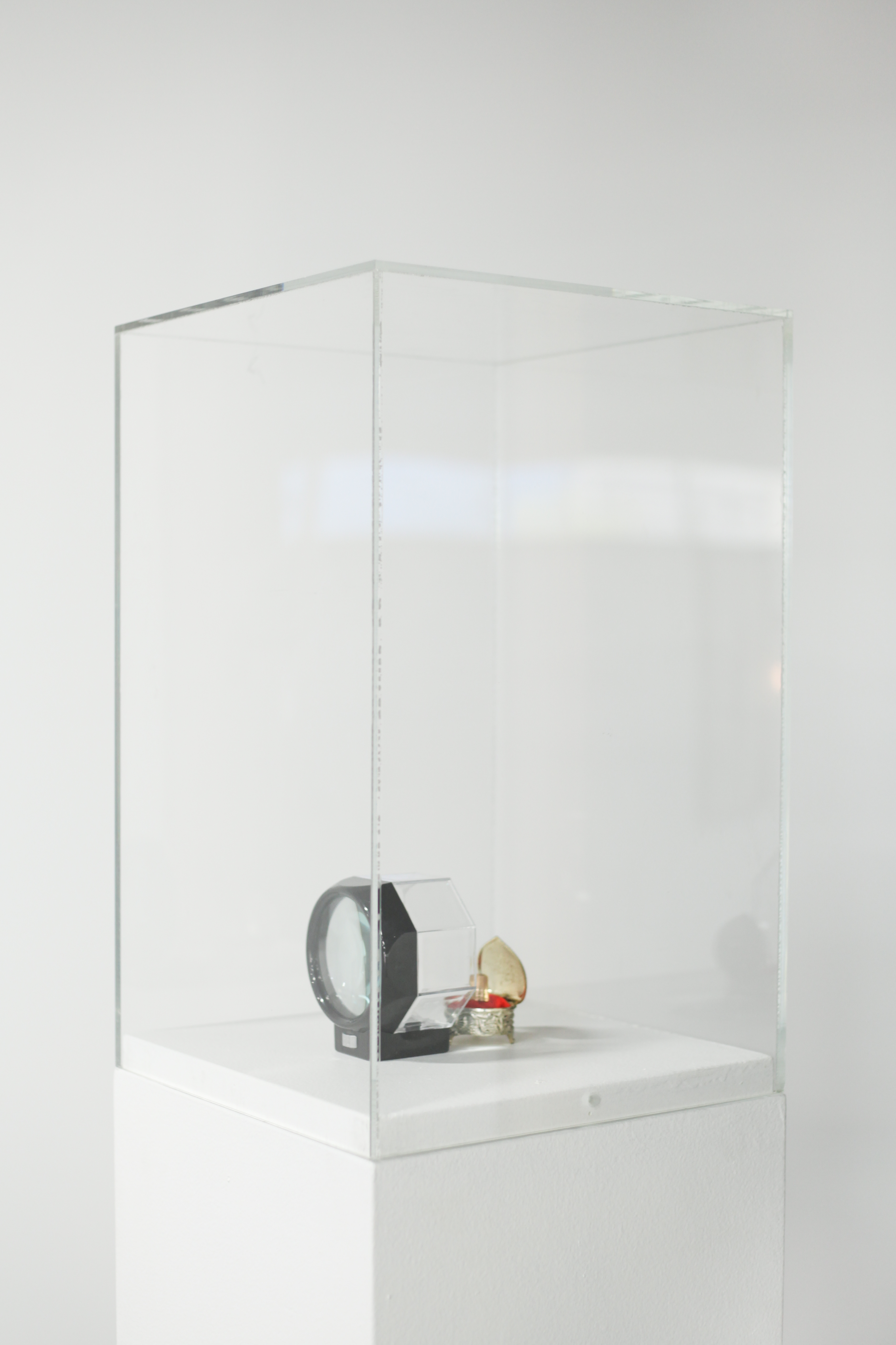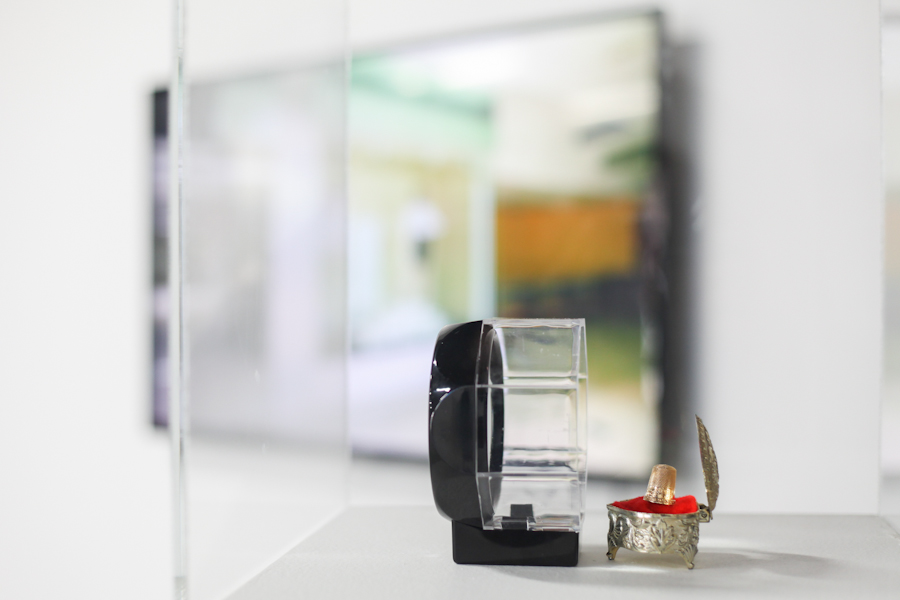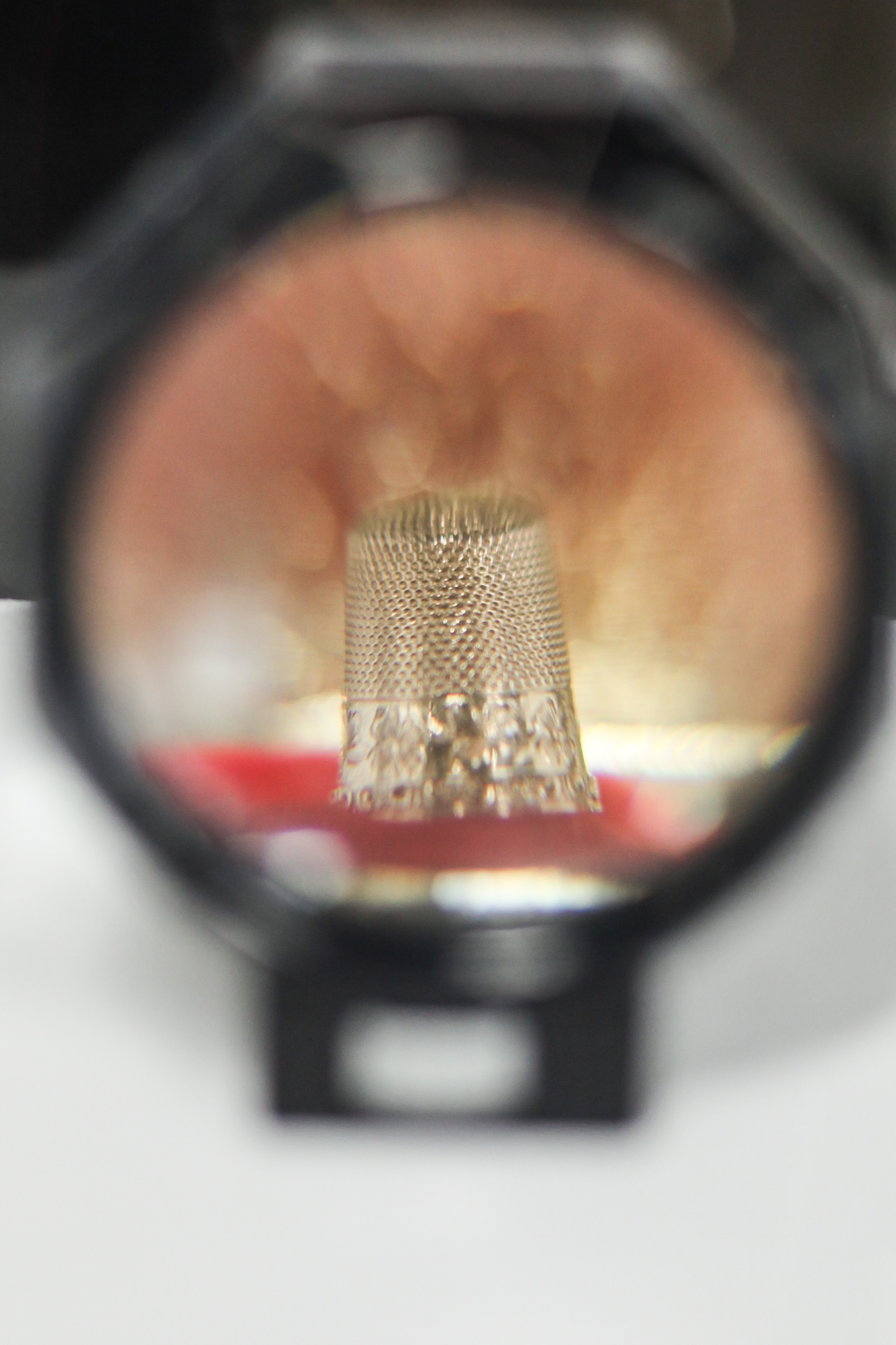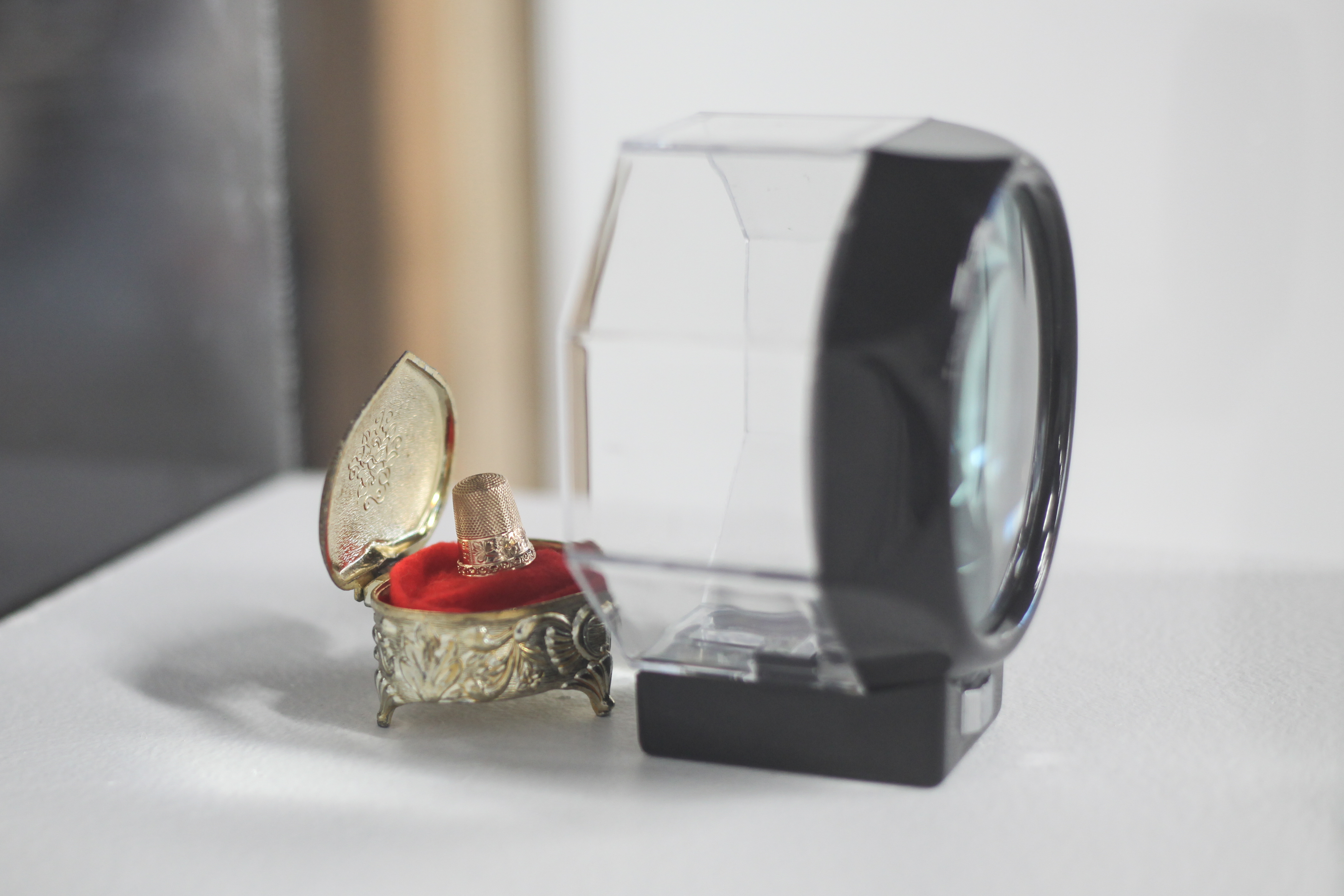 The video of this performance was presented as an installation at The Luminary Center for the Arts, along with a magnified antique golden thimble sitting on red velvet in an 1950’s trinket box. Viewers could look through the magnification device to see intricate detail.