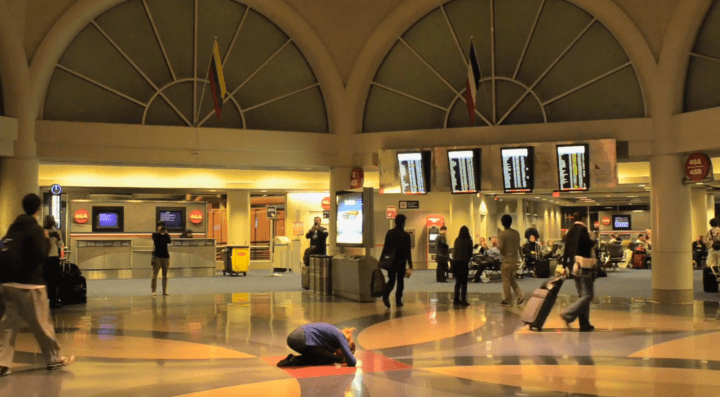 The artist performs a series of amateur yoga poses in the main mecca of the Los Angeles airport. The performer, at times looks at ease and other times, like a corpse laying motionless on the floor. The behavior of the passersby reveals that the body goes almost unnoticed as they walk to their next destination. The video documentation creates dissonance between the viewer and the scenario created by the performance as viewers question the inaction of passersby.