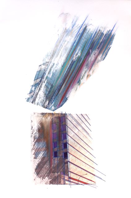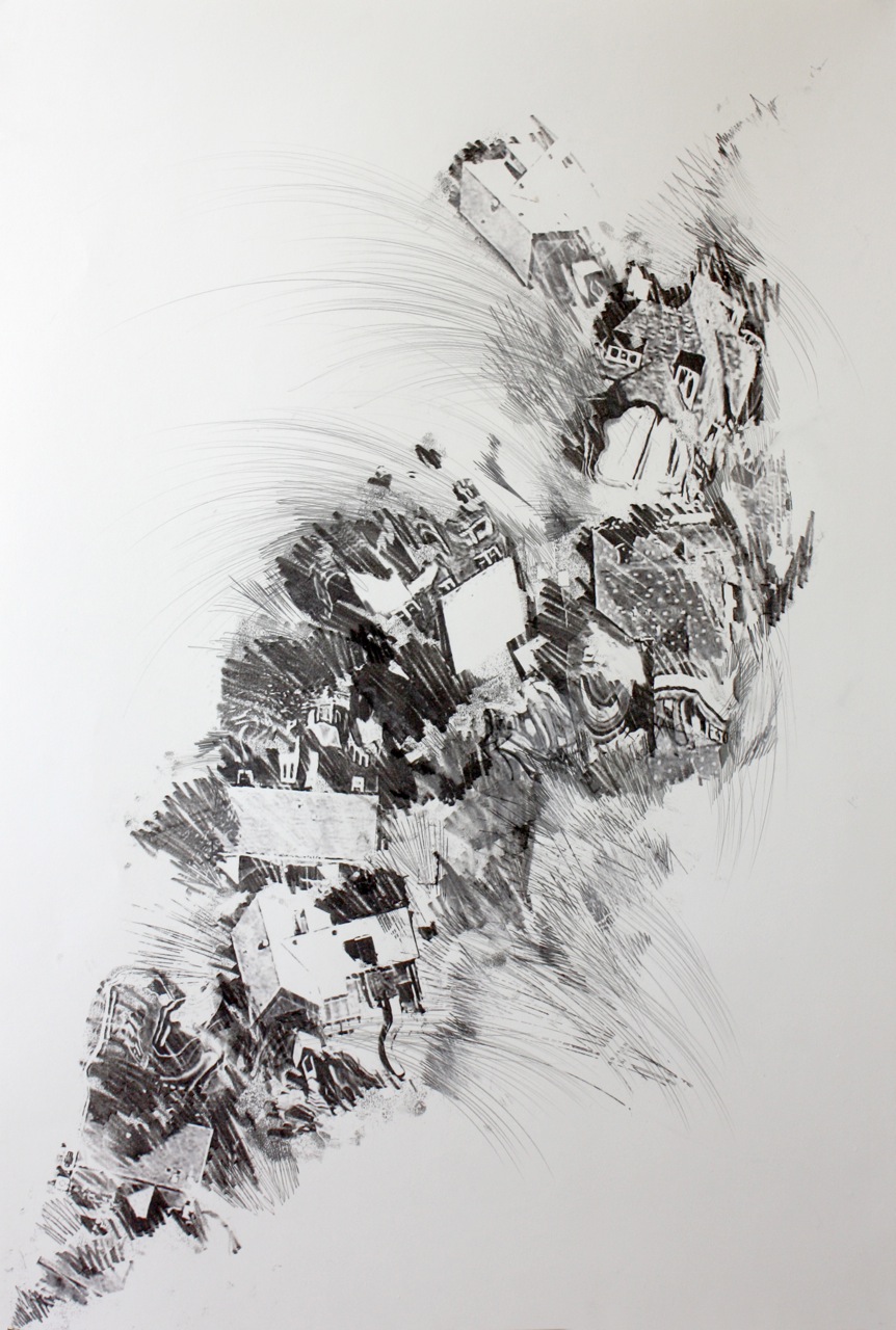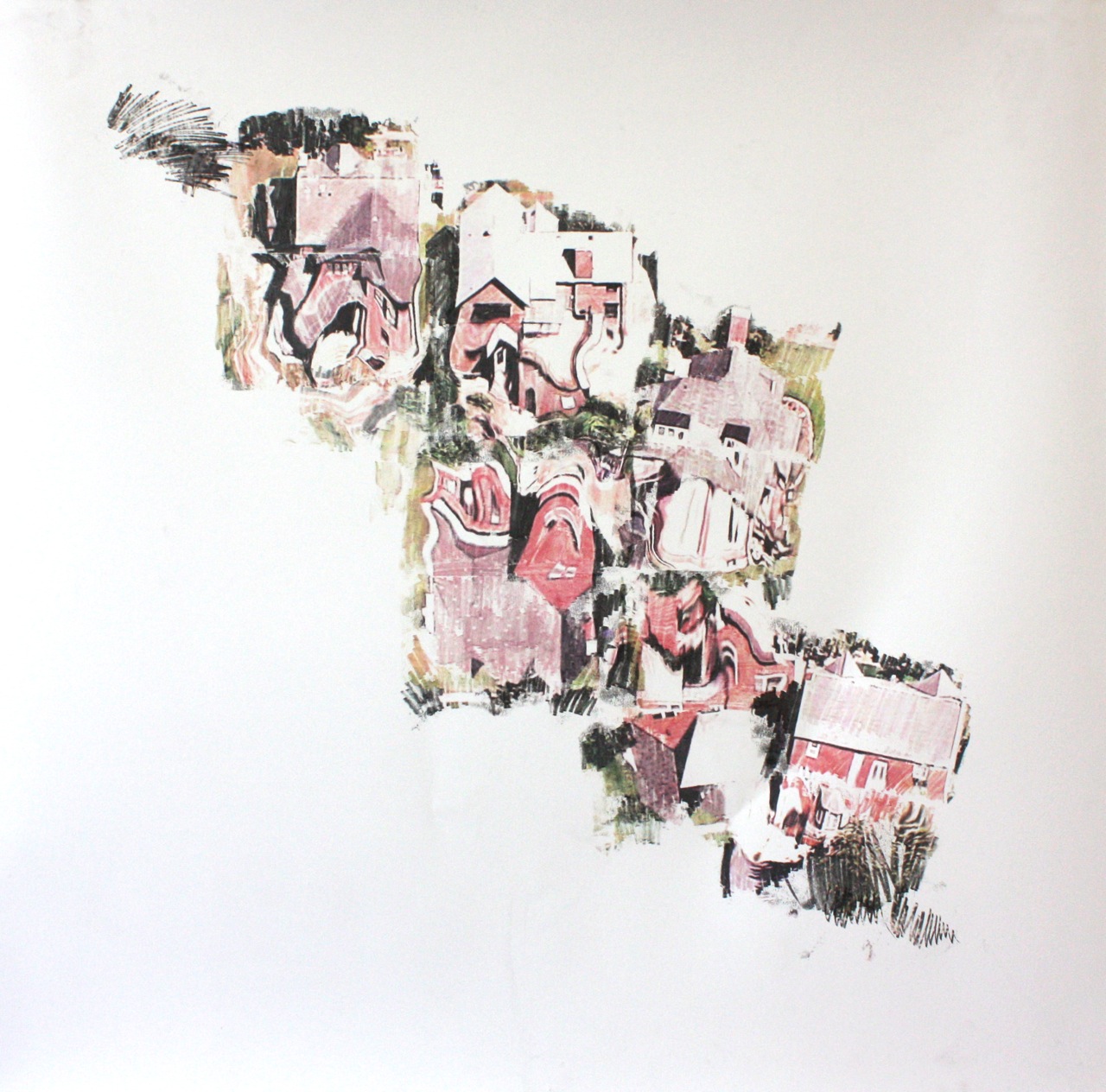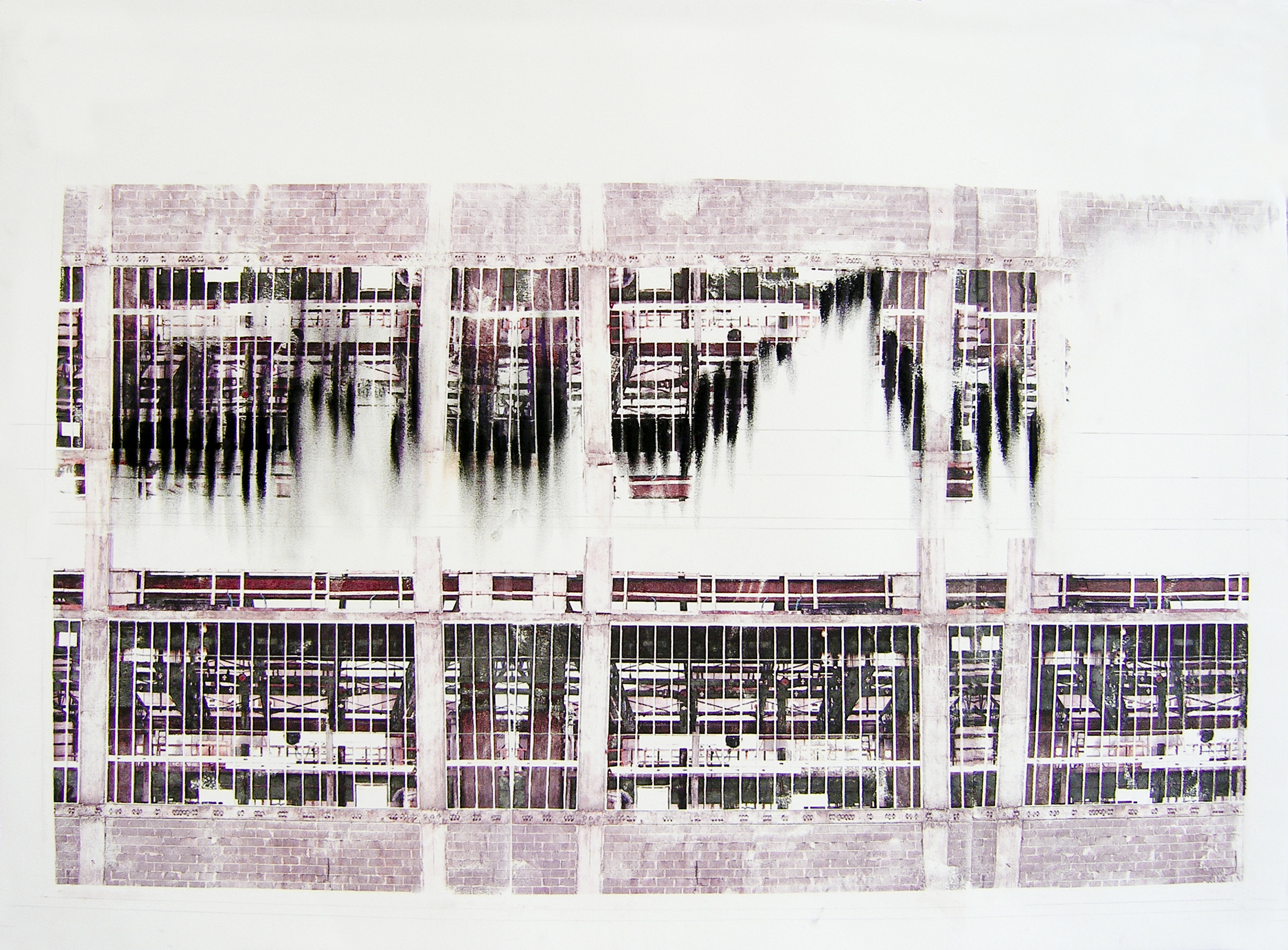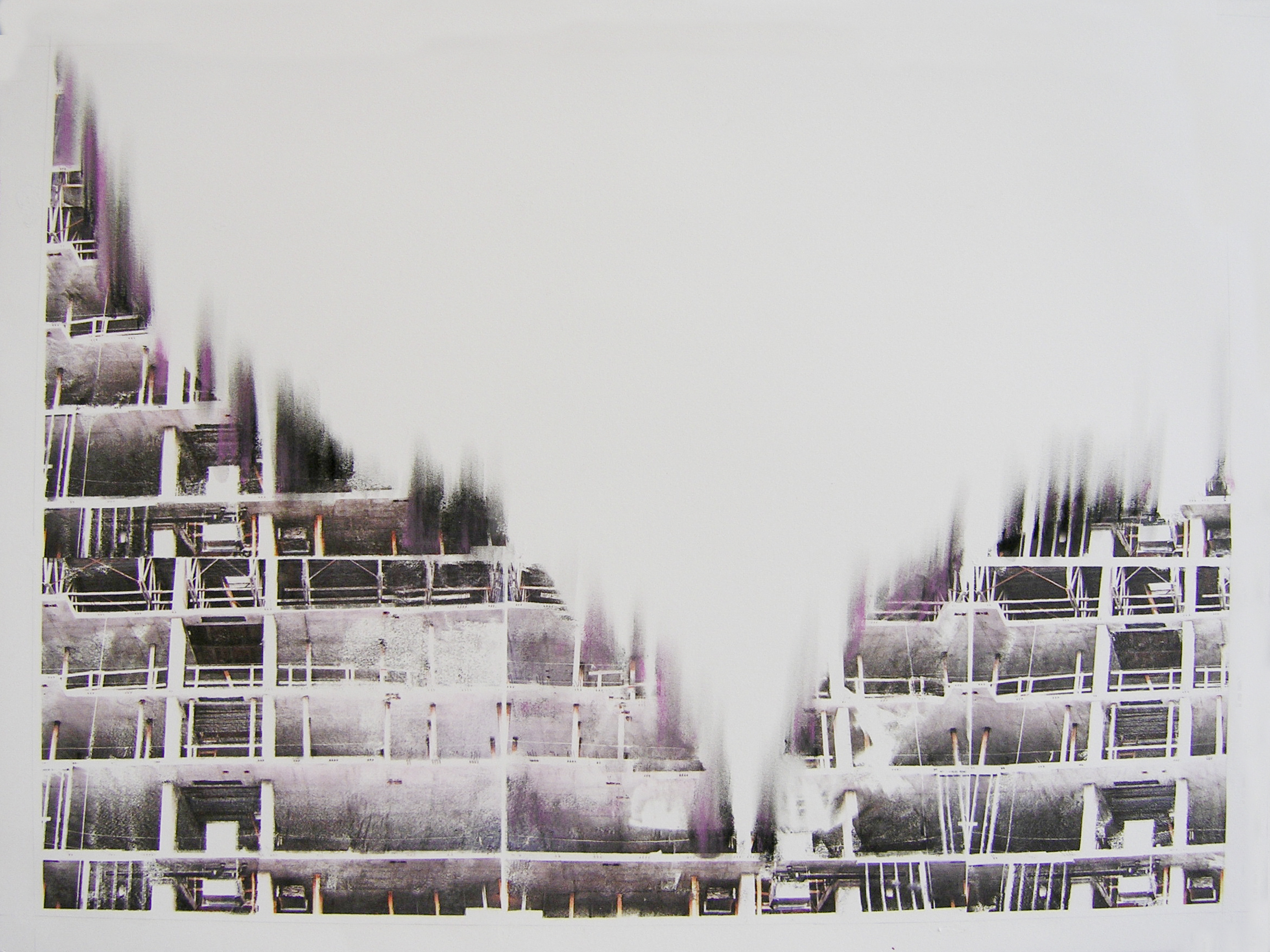 These drawings use the process of photographic transfer printmaking in combination with chalk pastels and graphite. I make laser-jet prints of found and original photographic imagery, and transfer the photos to new paper as a hand-printed mirror image of the original using non-toxic chemicals that strip the surface of the original paper. The result becomes textured hand-made maps, distorted architectural facades, and chaotic landscapes.