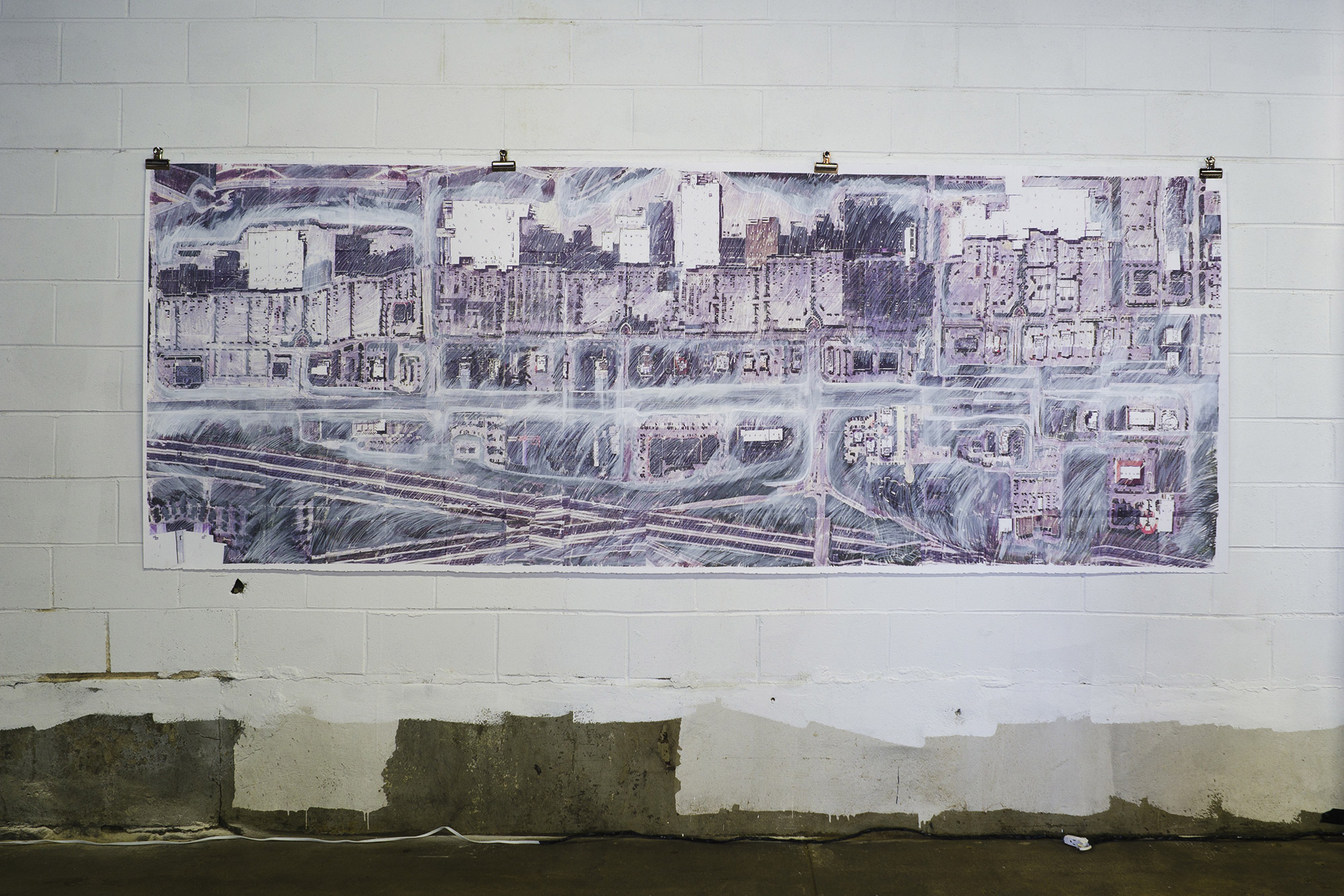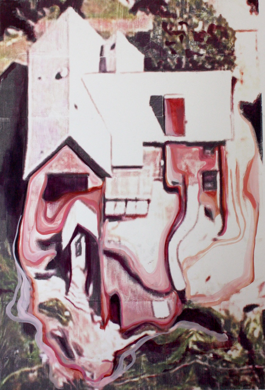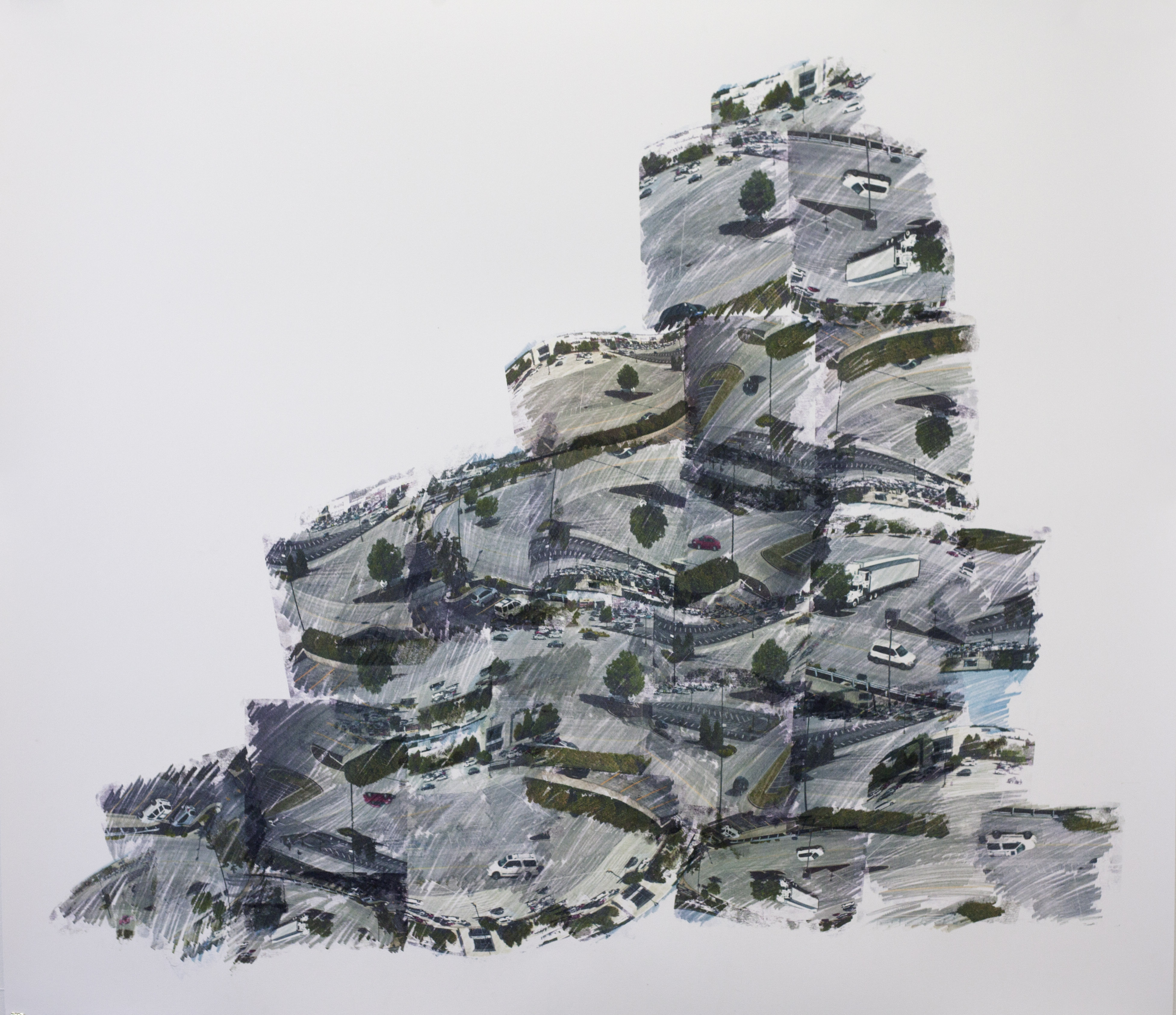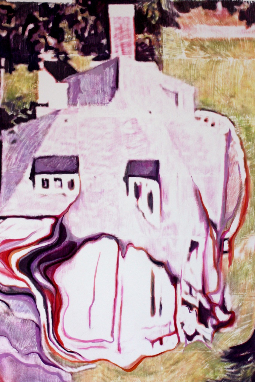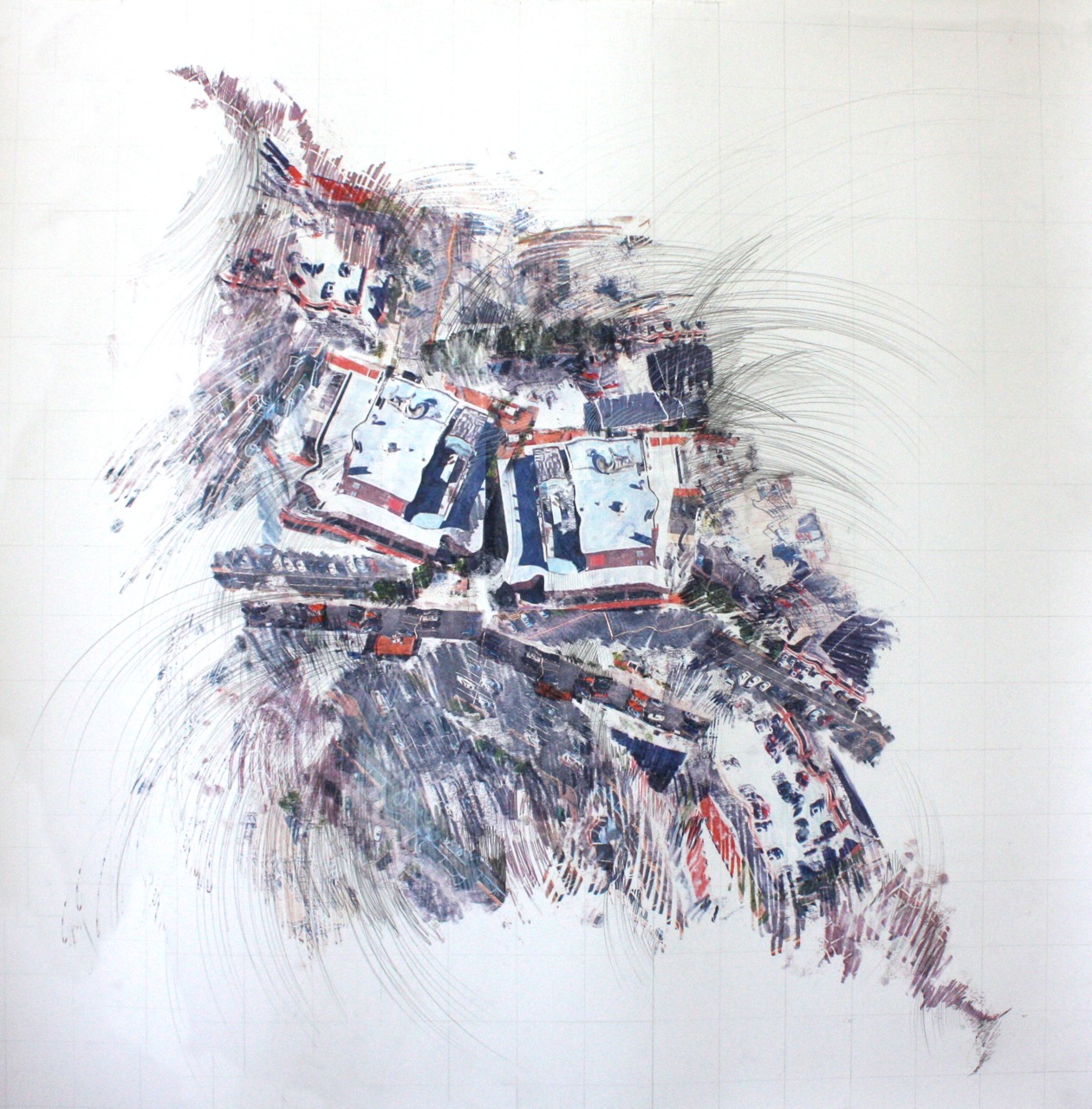 These drawings use the process of photographic transfer printmaking in combination with chalk pastels and graphite. I make laser-jet prints of found and original photographic imagery, and transfer the photos to new paper as a hand-printed mirror image of the original using non-toxic chemicals that strip the surface of the original paper. The result becomes textured hand-made maps, distorted architectural facades, and chaotic landscapes.