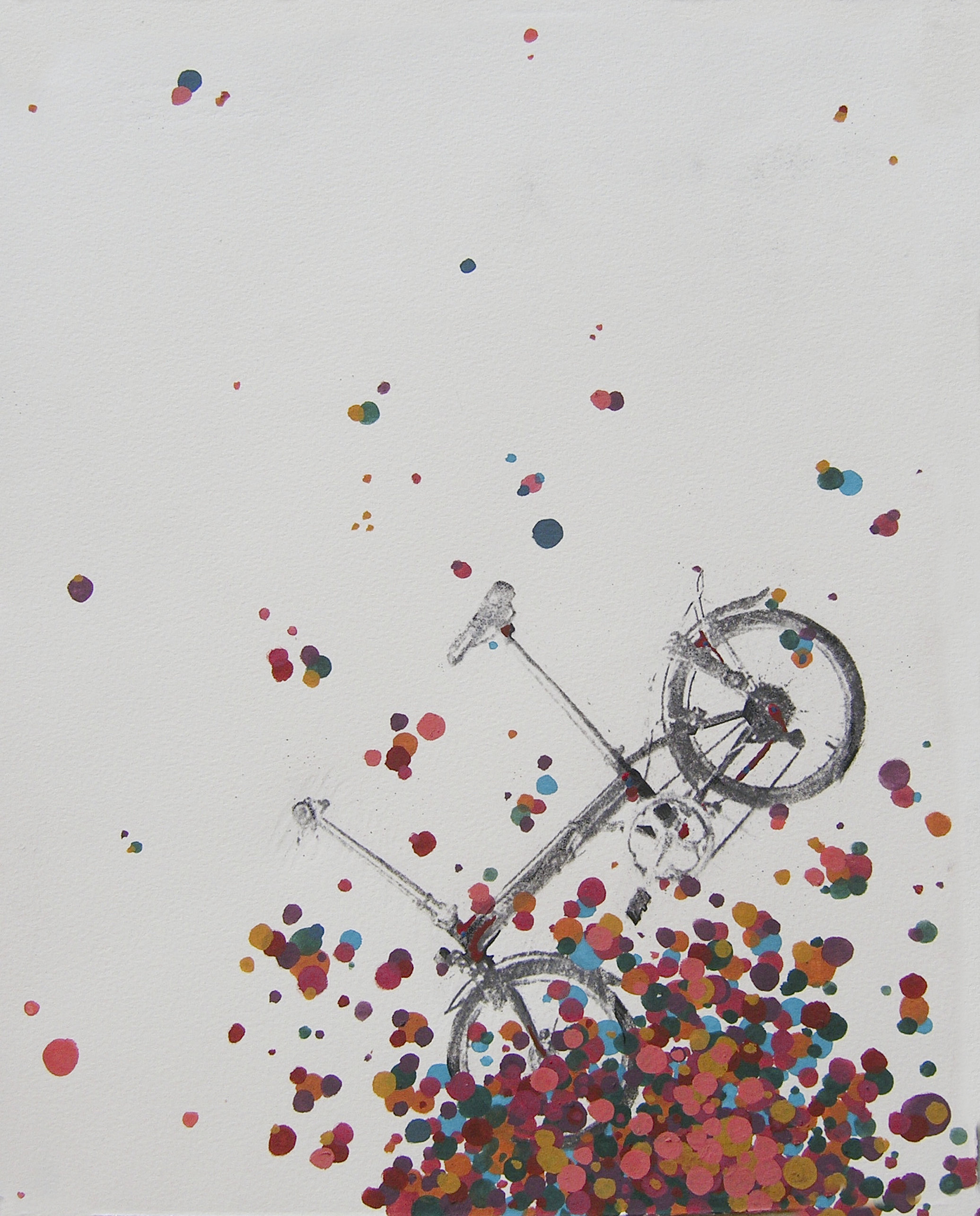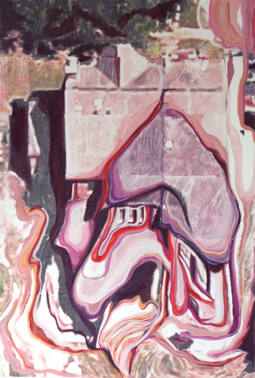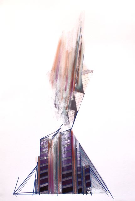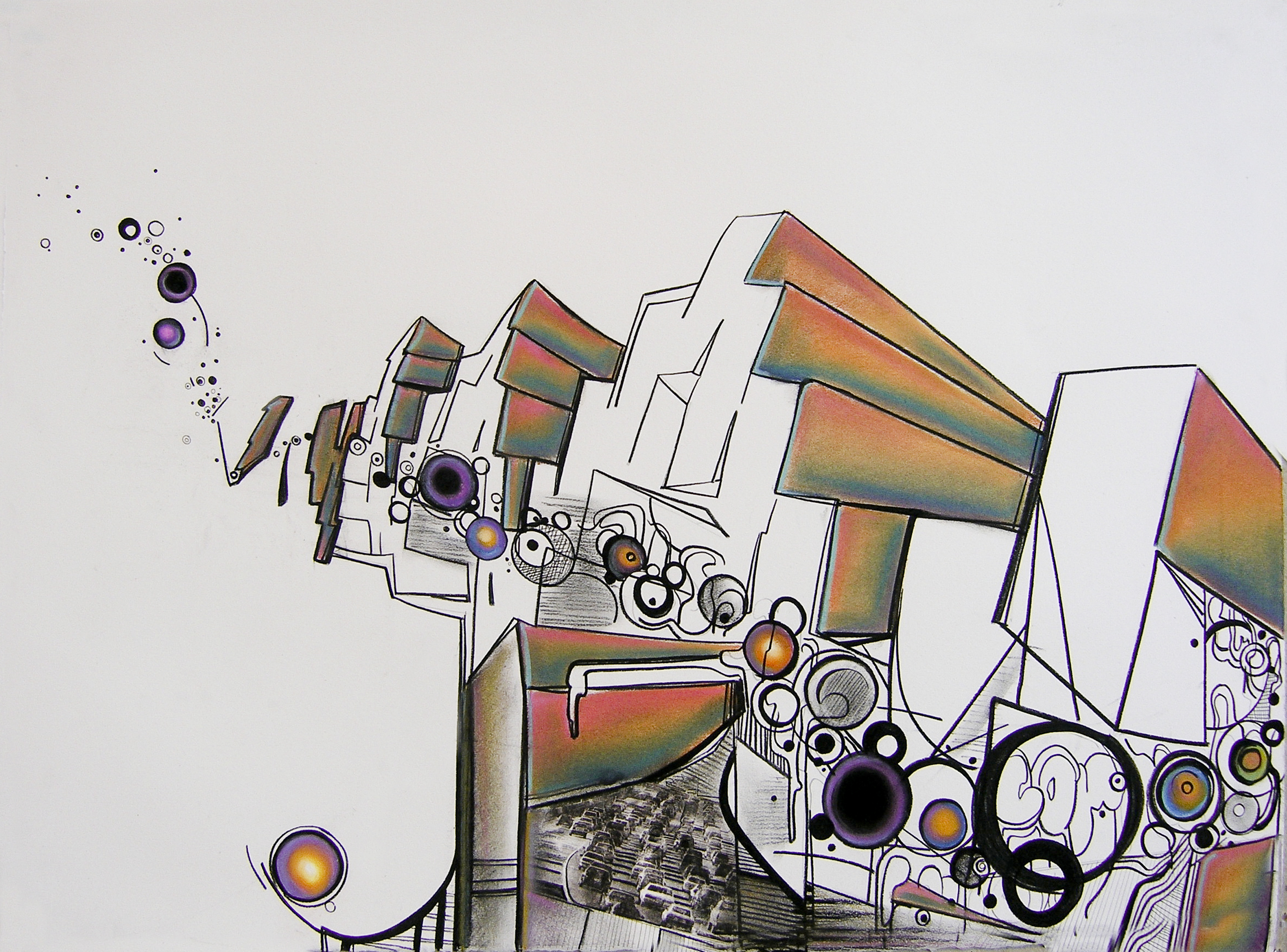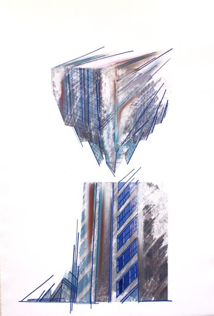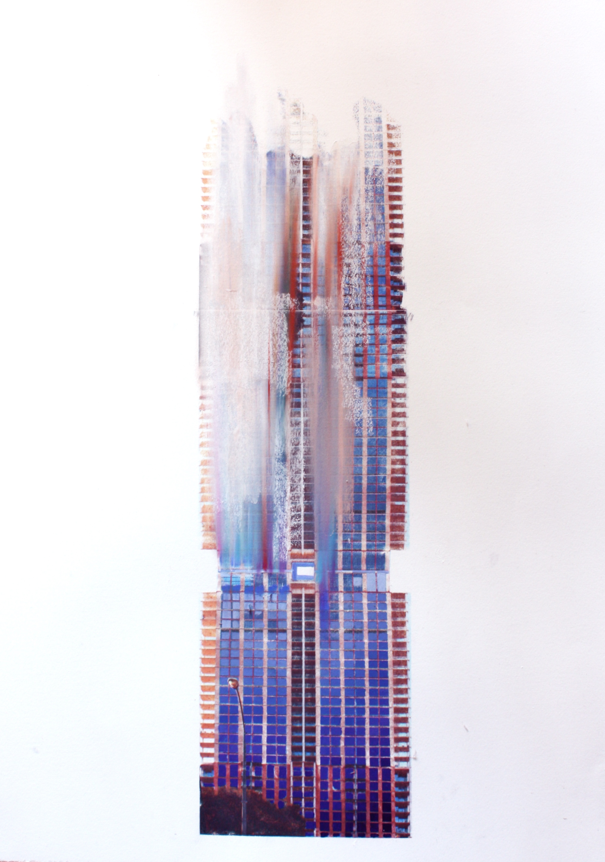 These drawings use the process of photographic transfer printmaking in combination with chalk pastels and graphite. I make laser-jet prints of found and original photographic imagery, and transfer the photos to new paper as a hand-printed mirror image of the original using non-toxic chemicals that strip the surface of the original paper. The result becomes textured hand-made maps, distorted architectural facades, and chaotic landscapes.