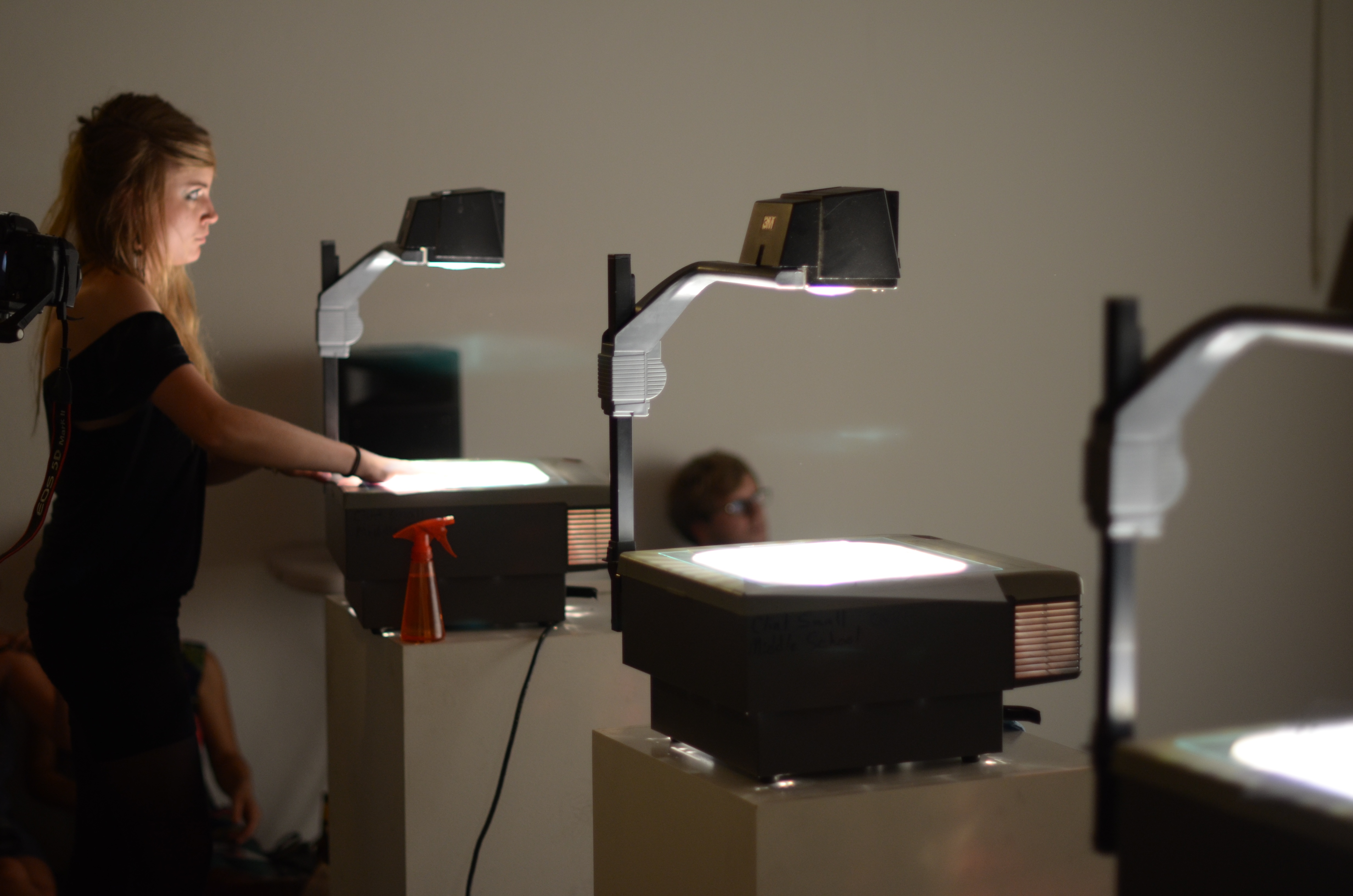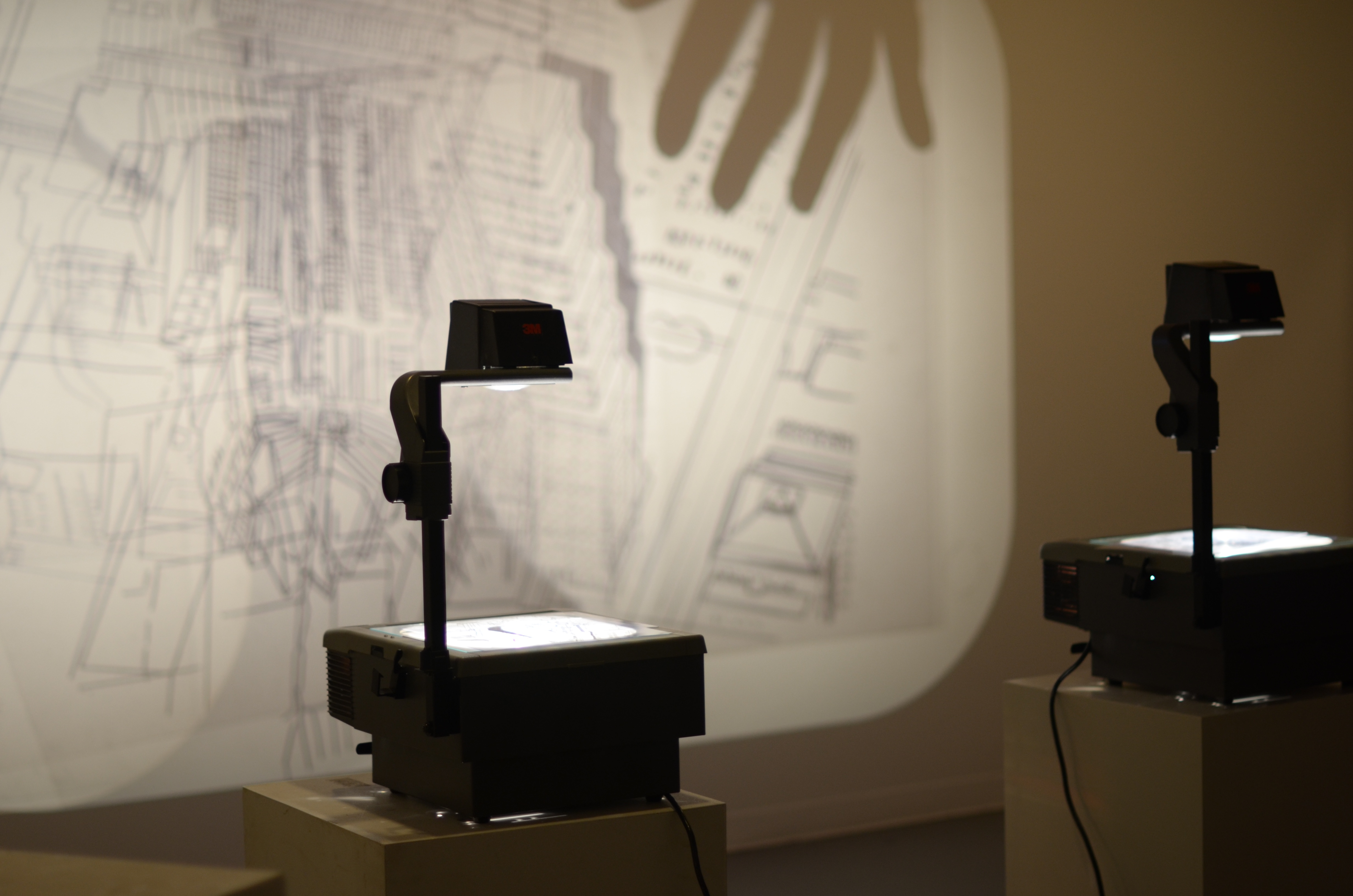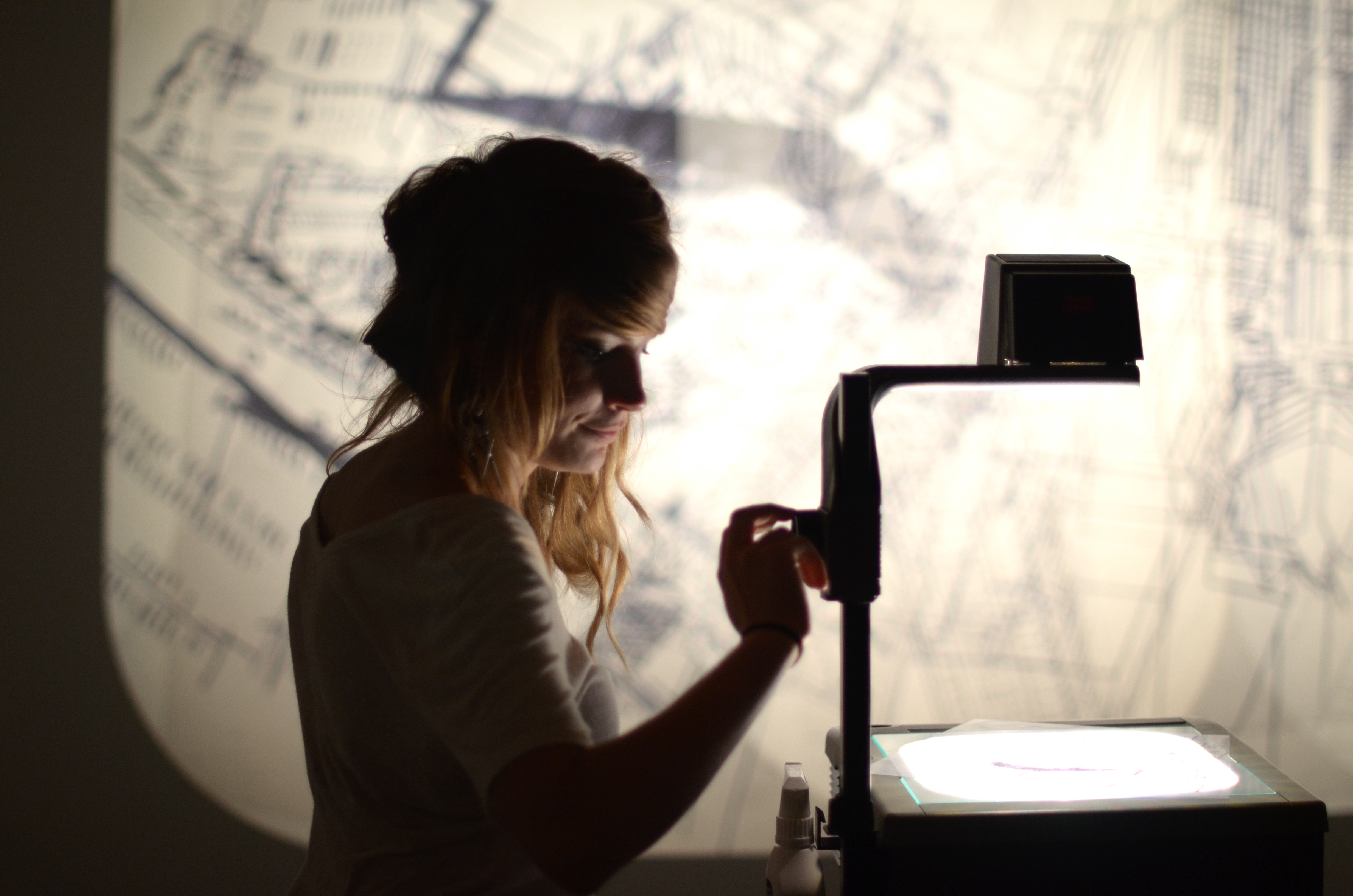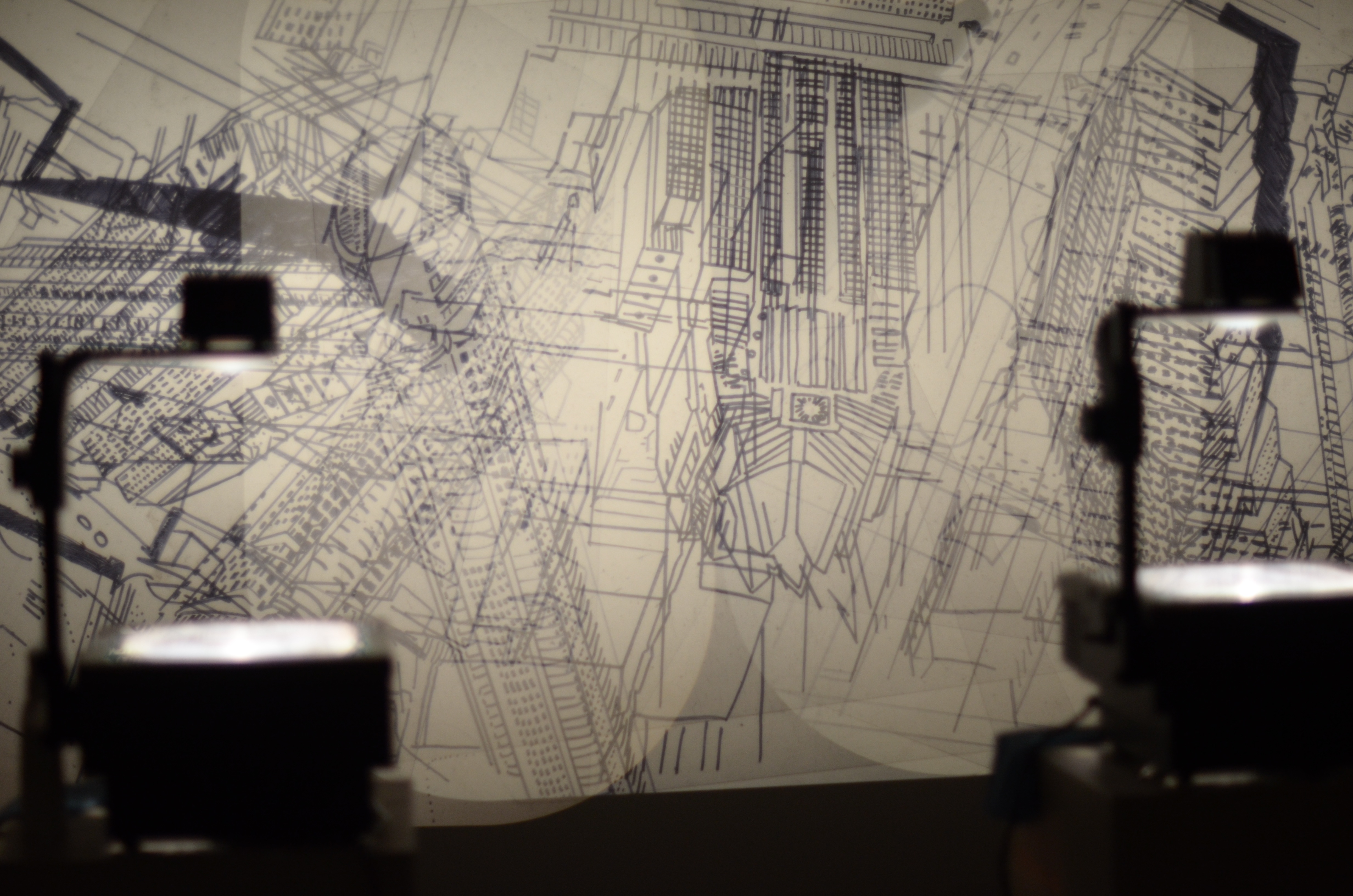 The performance explores relationships between sounds and images that have been manipulated, deconstructed and reassembled. The visual component displays light-projected building facades captured by Google Maps satellites, cut into pieces, and re-rectified into a temporal landscape on multiple transparencies. As the images and sound converge, multiple landscapes are layered, erased, and reconstructed on the wall. The sound will include a constant ambient pre-recorded track layering a collage of classical works (by composers such as Schoenberg and Mahler) and the live noise will progressively distort it. After the first fifteen minutes, viewers may participate by projecting and erasing their own images drawn on distributed transparencies.