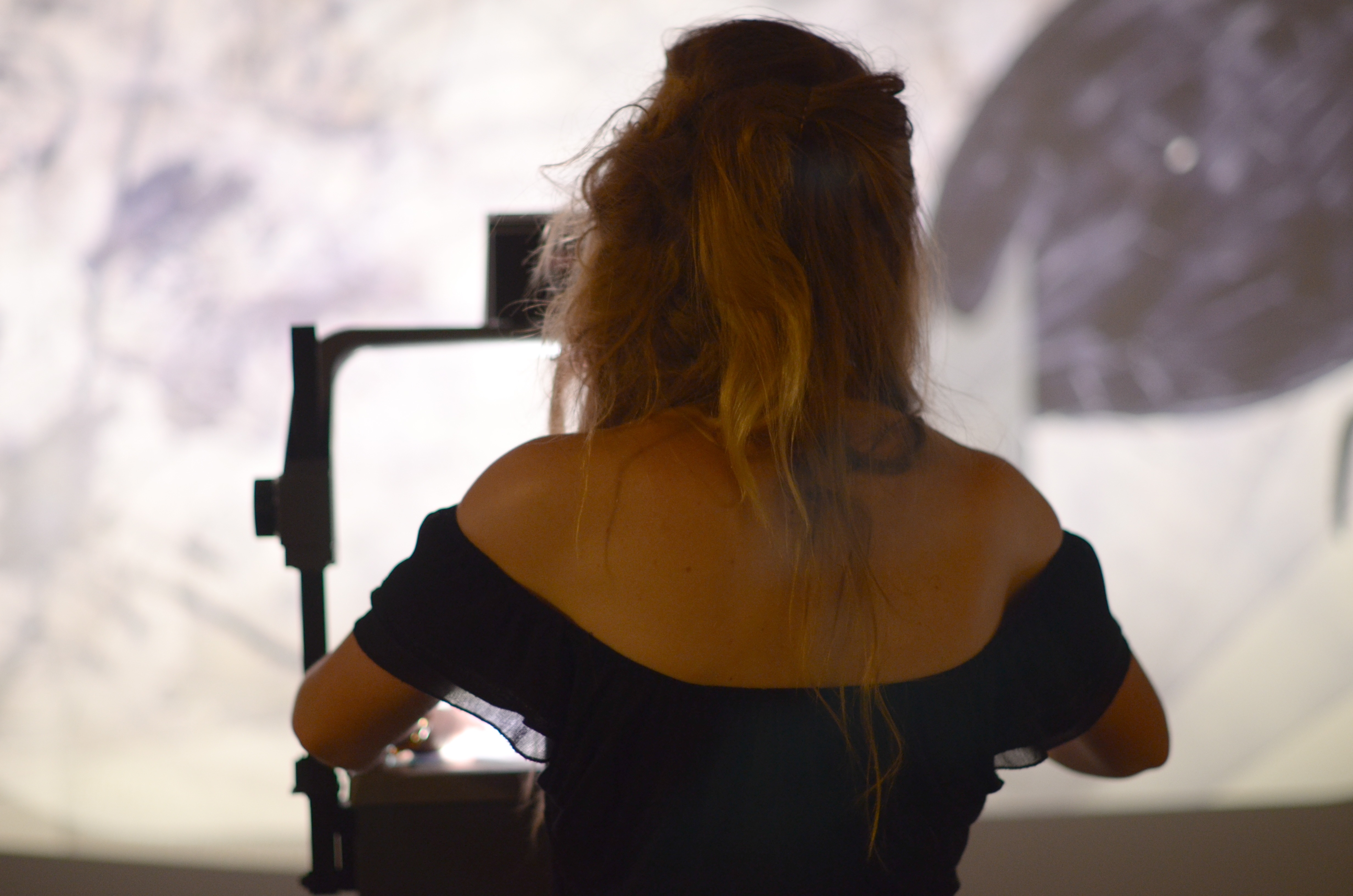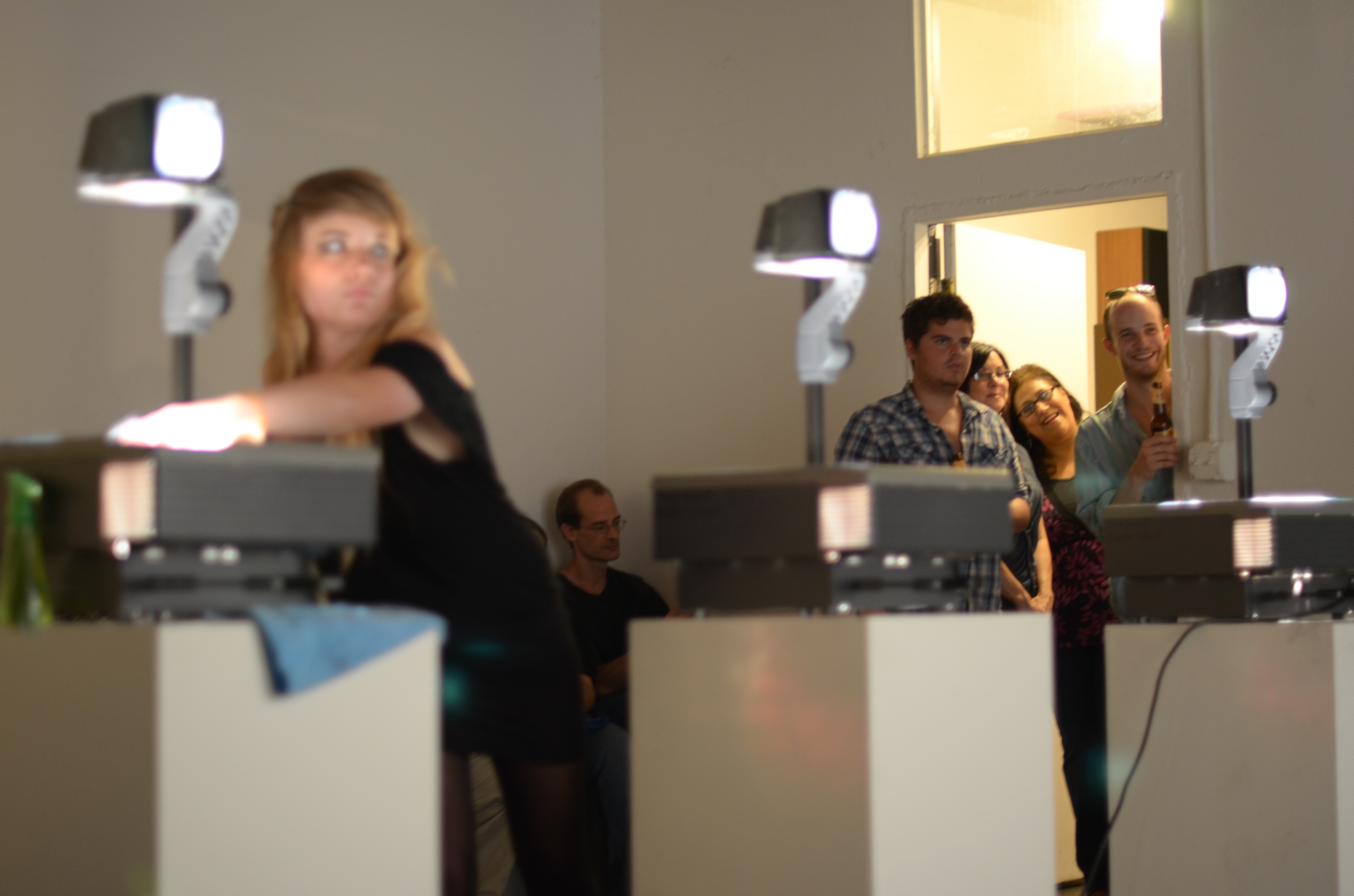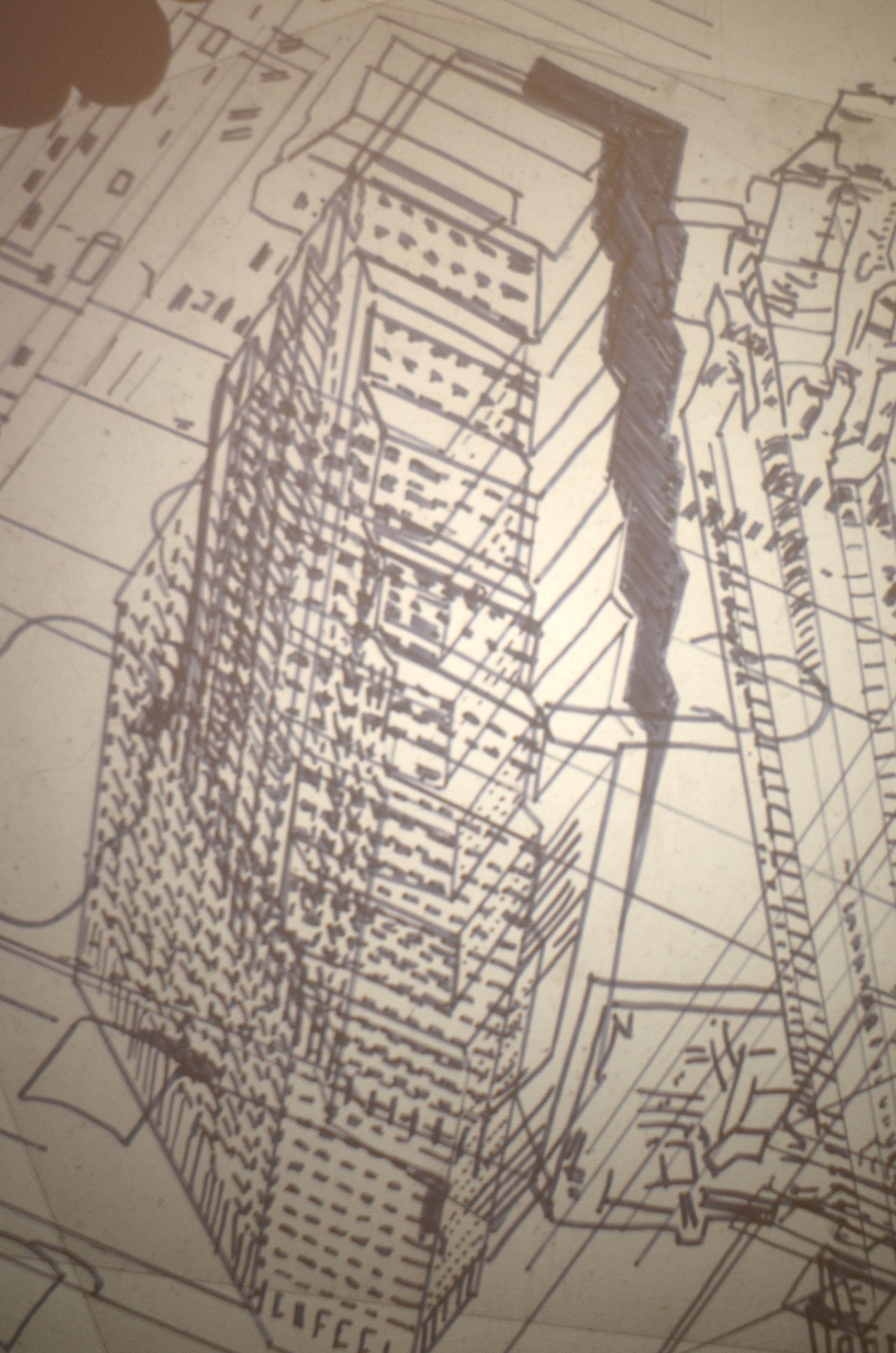 The performance explores relationships between sounds and images that have been manipulated, deconstructed and reassembled. The visual component displays light-projected building facades captured by Google Maps satellites, cut into pieces, and re-rectified into a temporal landscape on multiple transparencies. As the images and sound converge, multiple landscapes are layered, erased, and reconstructed on the wall. The sound will include a constant ambient pre-recorded track layering a collage of classical works (by composers such as Schoenberg and Mahler) and the live noise will progressively distort it. After the first fifteen minutes, viewers may participate by projecting and erasing their own images drawn on distributed transparencies.