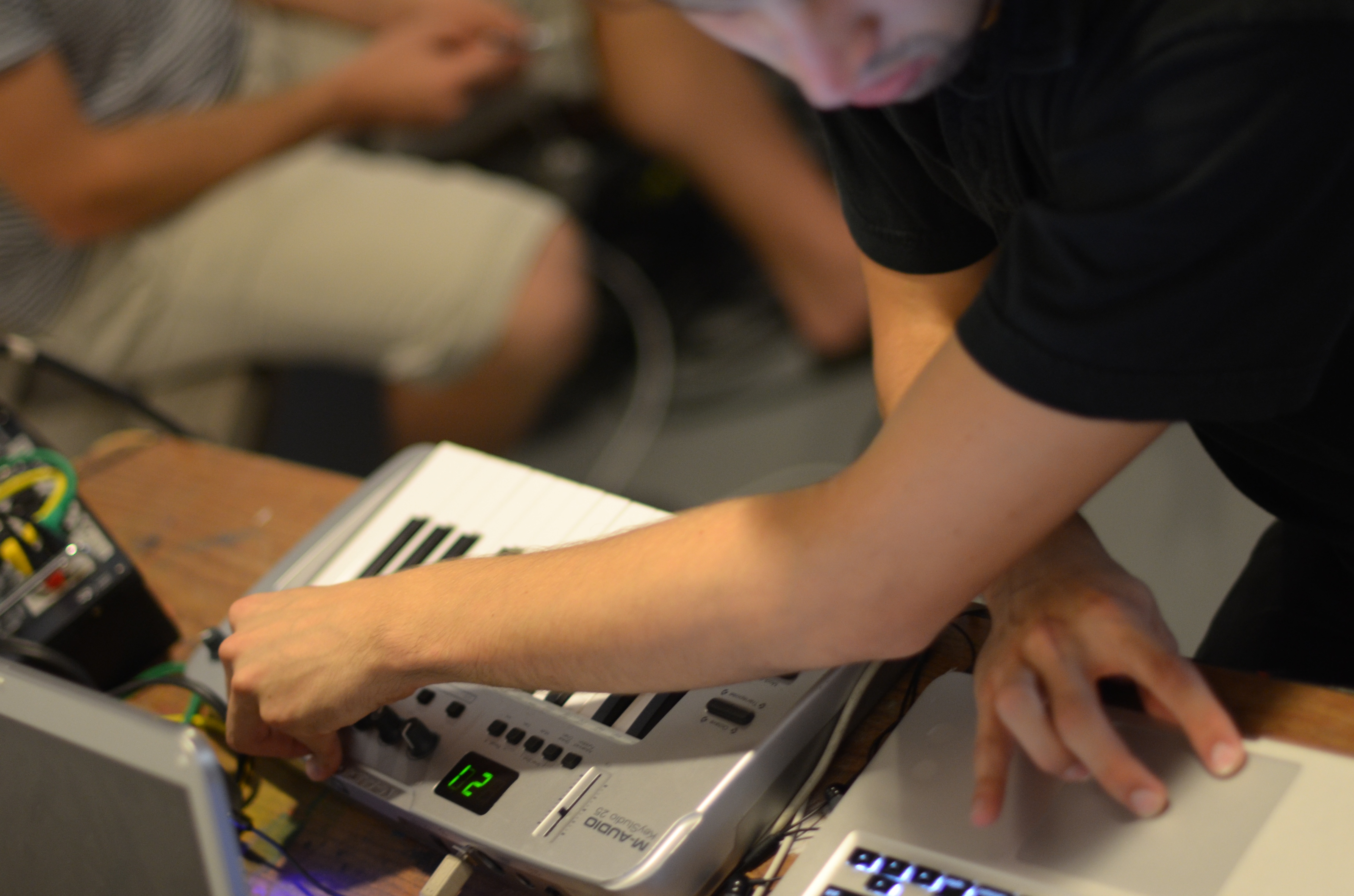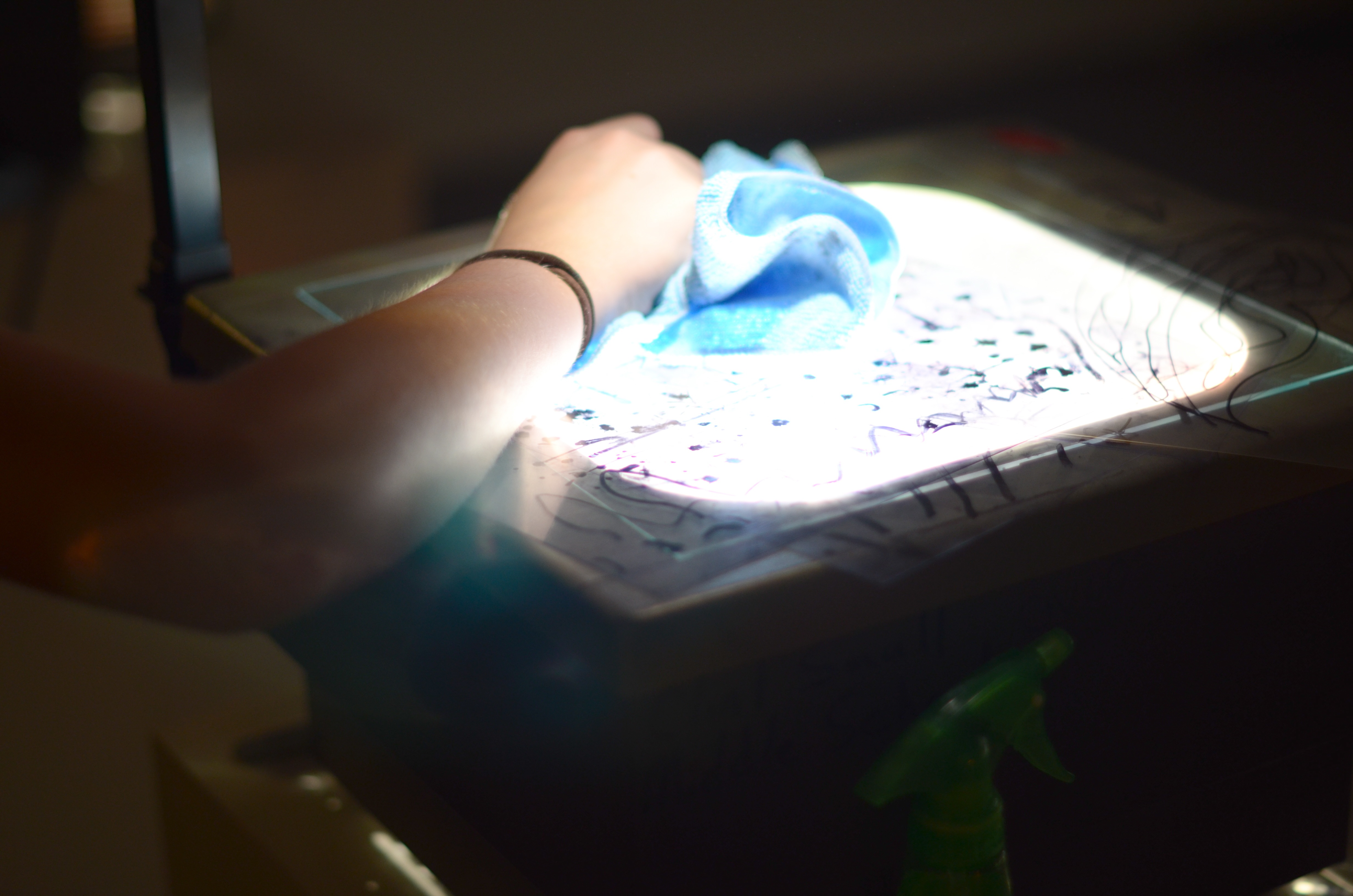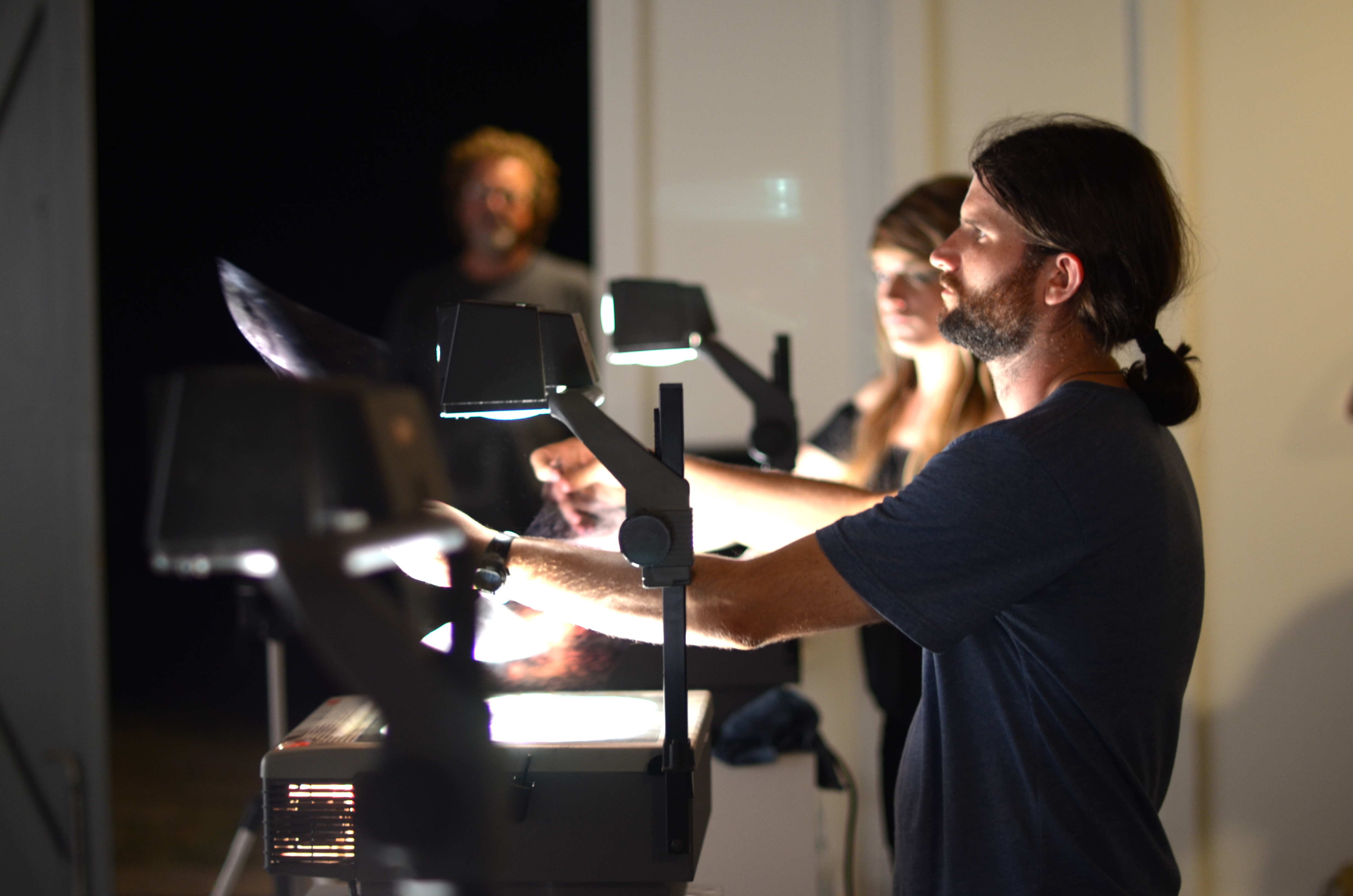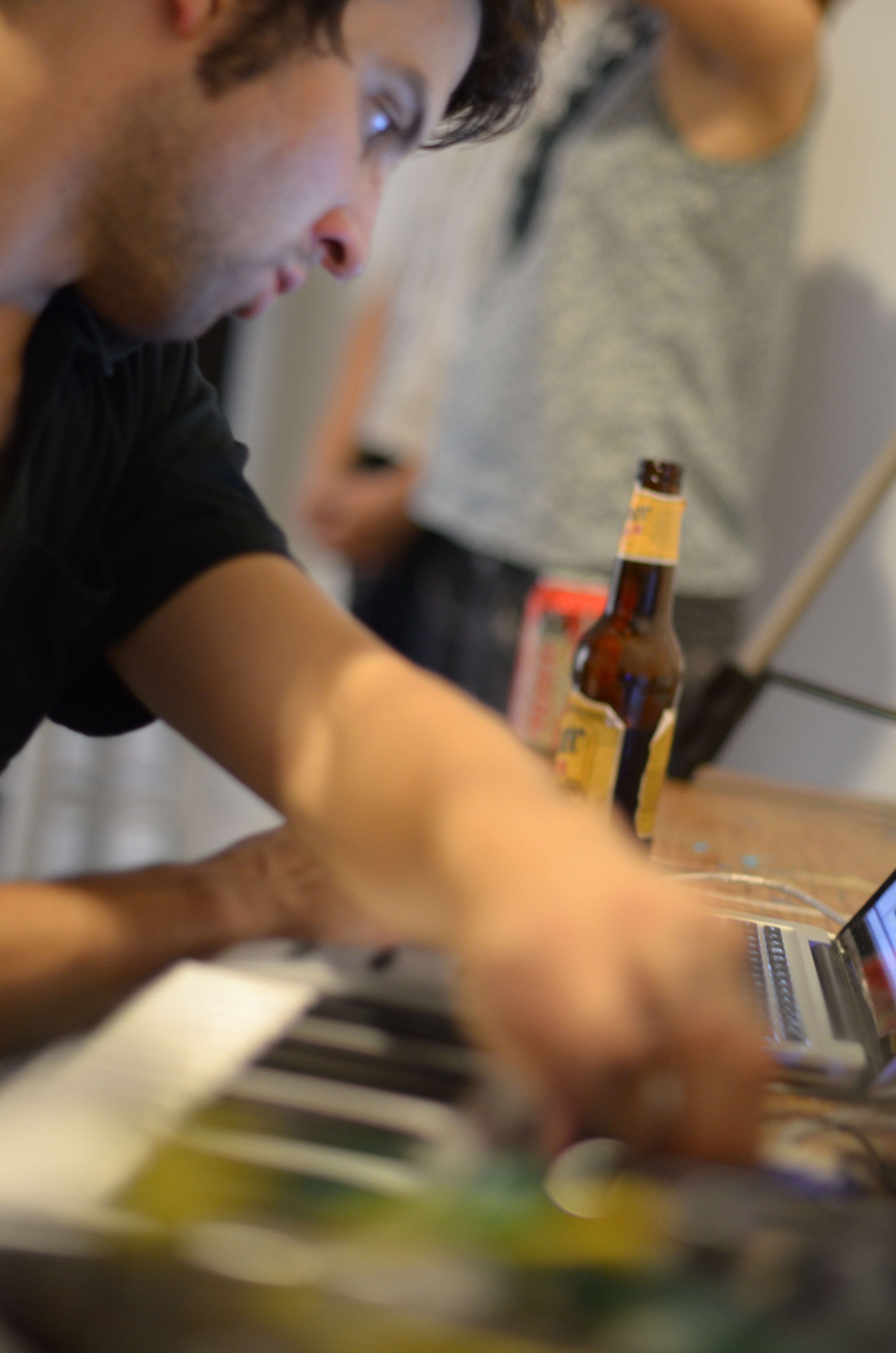 The performance explores relationships between sounds and images that have been manipulated, deconstructed and reassembled. The visual component displays light-projected building facades captured by Google Maps satellites, cut into pieces, and re-rectified into a temporal landscape on multiple transparencies. As the images and sound converge, multiple landscapes are layered, erased, and reconstructed on the wall. The sound will include a constant ambient pre-recorded track layering a collage of classical works (by composers such as Schoenberg and Mahler) and the live noise will progressively distort it. After the first fifteen minutes, viewers may participate by projecting and erasing their own images drawn on distributed transparencies.