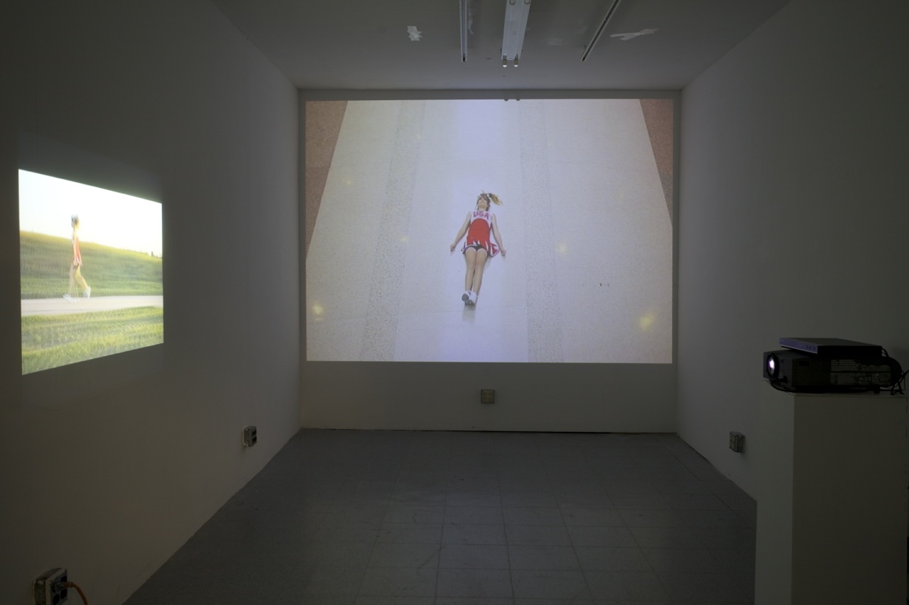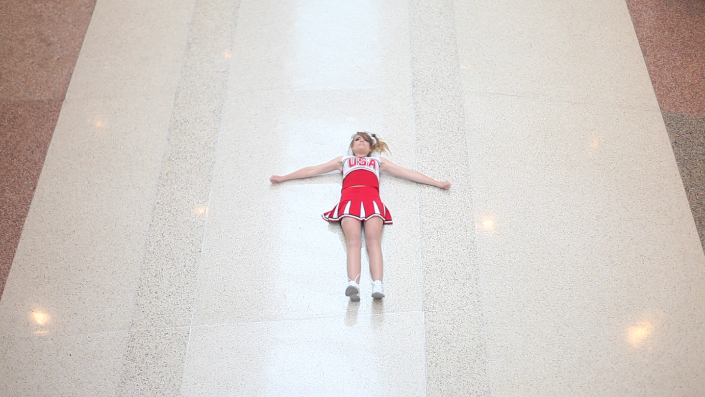 In this performance documentation video, the artist explores the performative aspect of production-based megachurch events while in character as a cheerleader and performing cheer routines on the floor of the largest United Methodist Church in America. The strange, rigid motions make the performer seem like a rubber doll, expressionlessly going through the motions of the routine. The centrality of the cheerleader, combined with poses with outstretched arms echo the iconography of the Christian church, while subverting it.