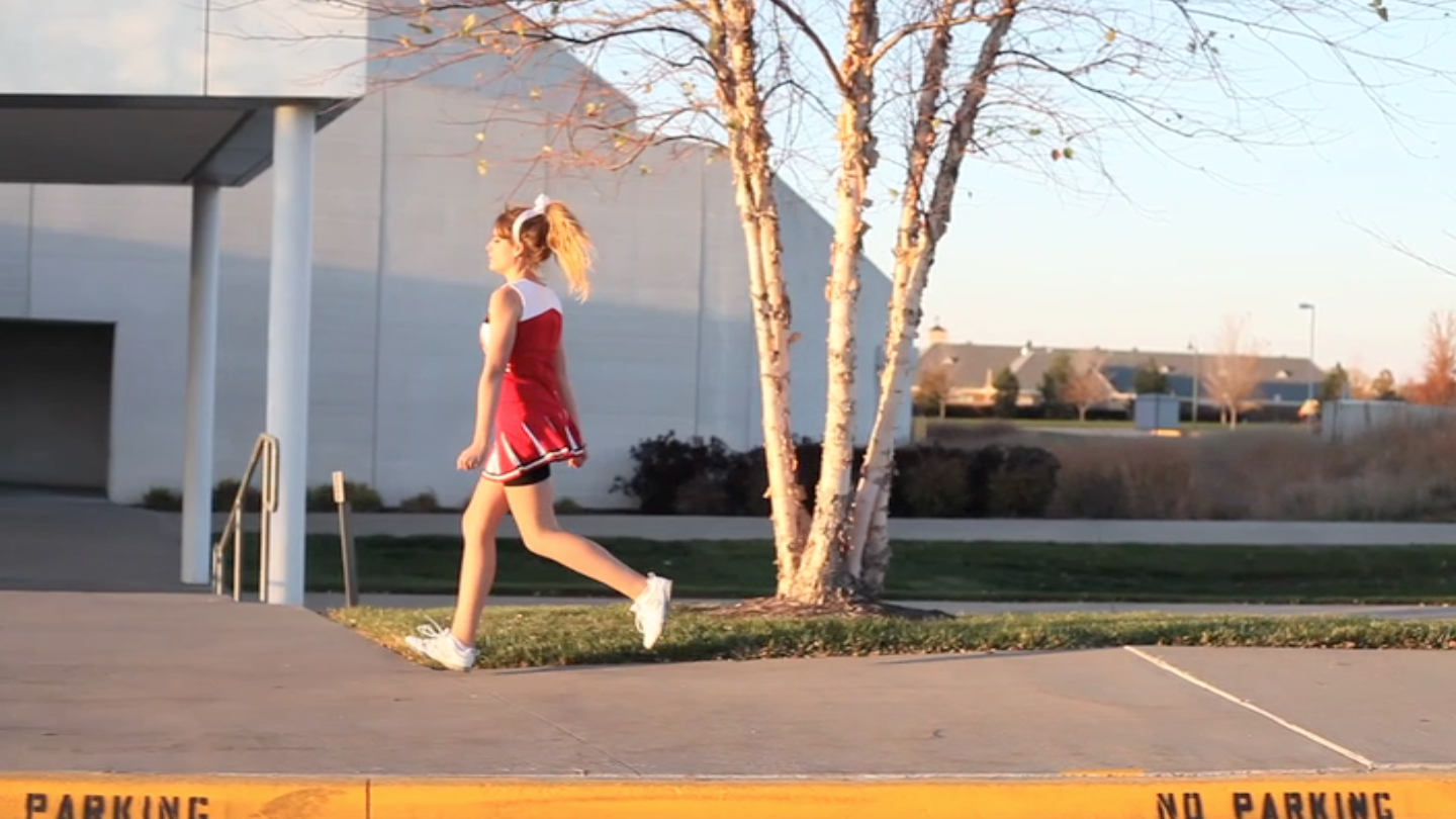After completing the floor poses, the cheerleader character runs around the perimeter of land that the has been obtained by the institution since it was founded. The performative actions become metaphors for both religious routines and land use practices in the suburban Midwest.