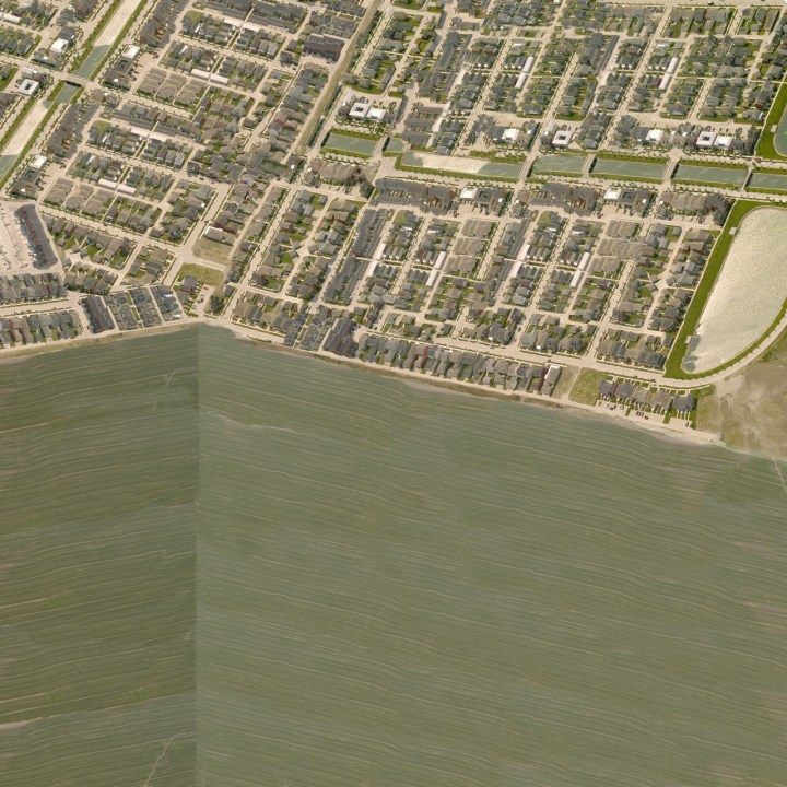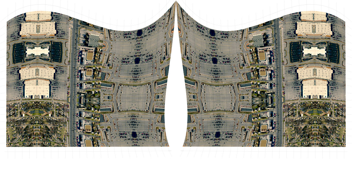 The artist created large digital prints (90″ x 44″) of reconfigured screenshots of Google aerial views created in the process of making Housing Crisis. As each print contains a mirror image of itself, each image casts the idea of duality – body and mind, two halves of a brain, the id and the ego. The artist questions the relationship of personal identity with the personal and physical landscapes in which it expresses itself.
