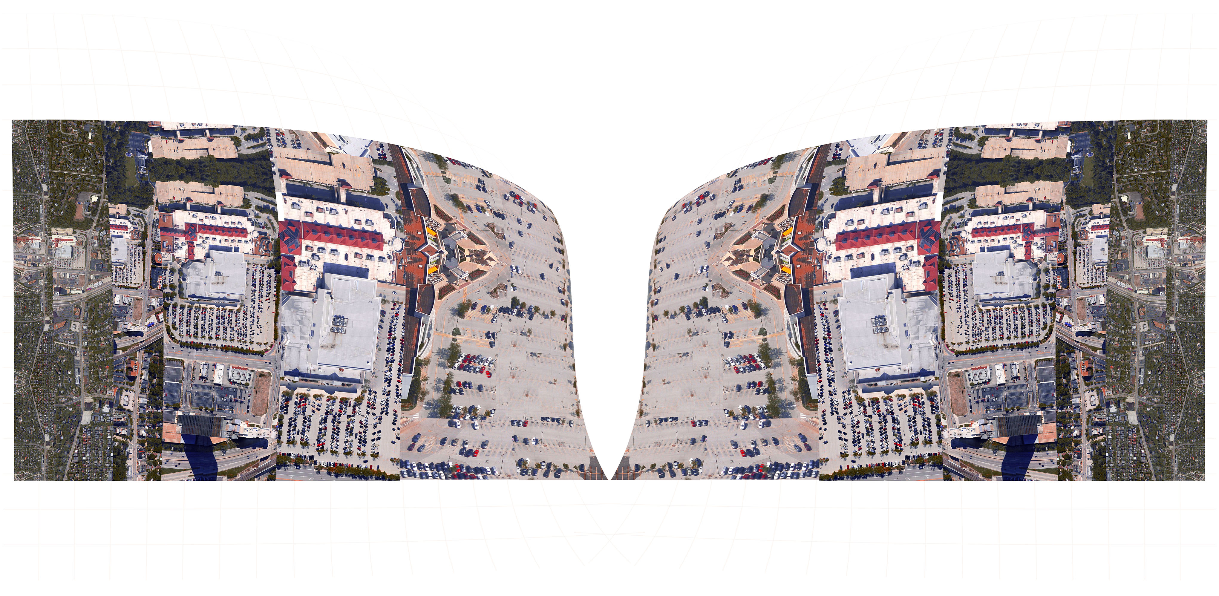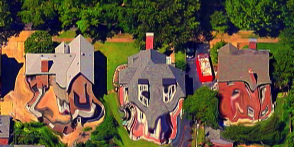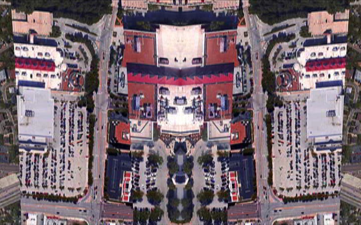 In Housing Crisis (2011), the artist transforms, warps, and disrupts aerial images from Google Satellite. The images show upper-middle class mansions in affluent suburban areas in the Midwest, strip malls, indoor shopping malls, and lifestyle centers. Through the processes of digital warping, melting, and fragmenting, the facades of the homes become uncanny anthropomorphized faces. The audio includes fragmented segments from orchestral compositions by Toru Takemitsu.